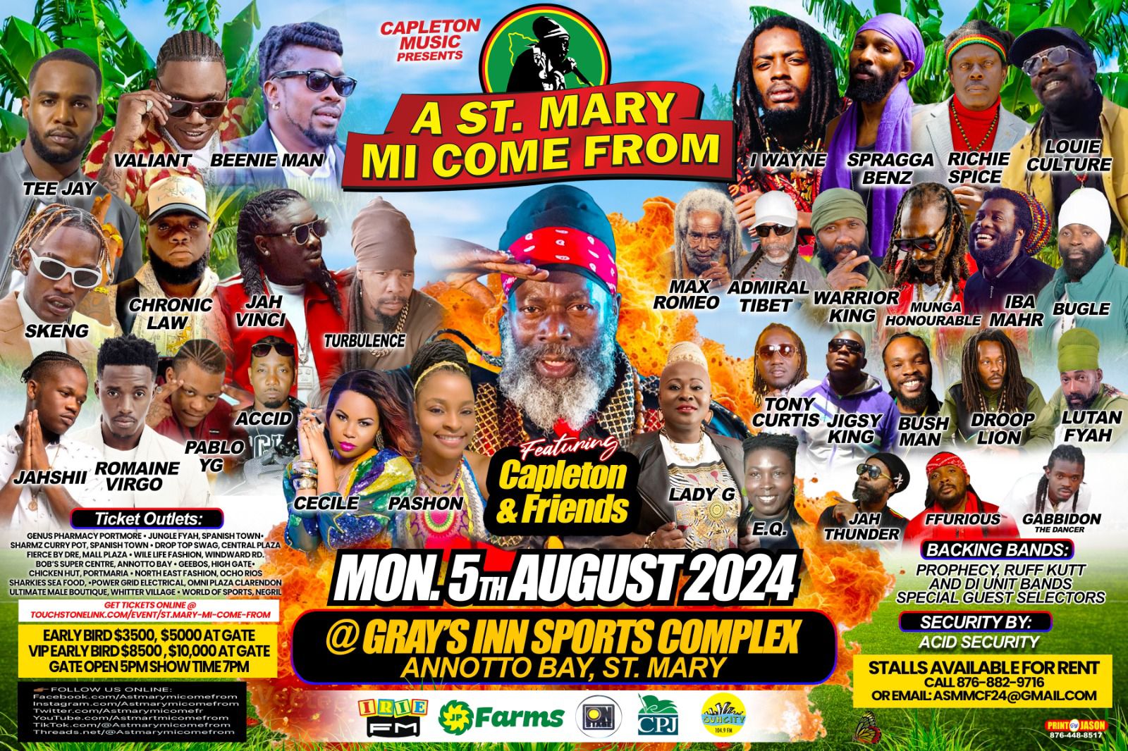 ........................This is the 24th Anniversary............................................The first show was in 2000...................................................................................Tickets will only be sold at the gate on the day of the show August 5th................................Doors Open: 5pm.............................Showtime: 7pm..............................Early Bird Admission: $3500 JMD .....................VIP: $8500 JMD..........................Special Guest Appearance by many artist...................................VENDORS can call 876-882-9716 or 876-882-9716 to rent stalls........